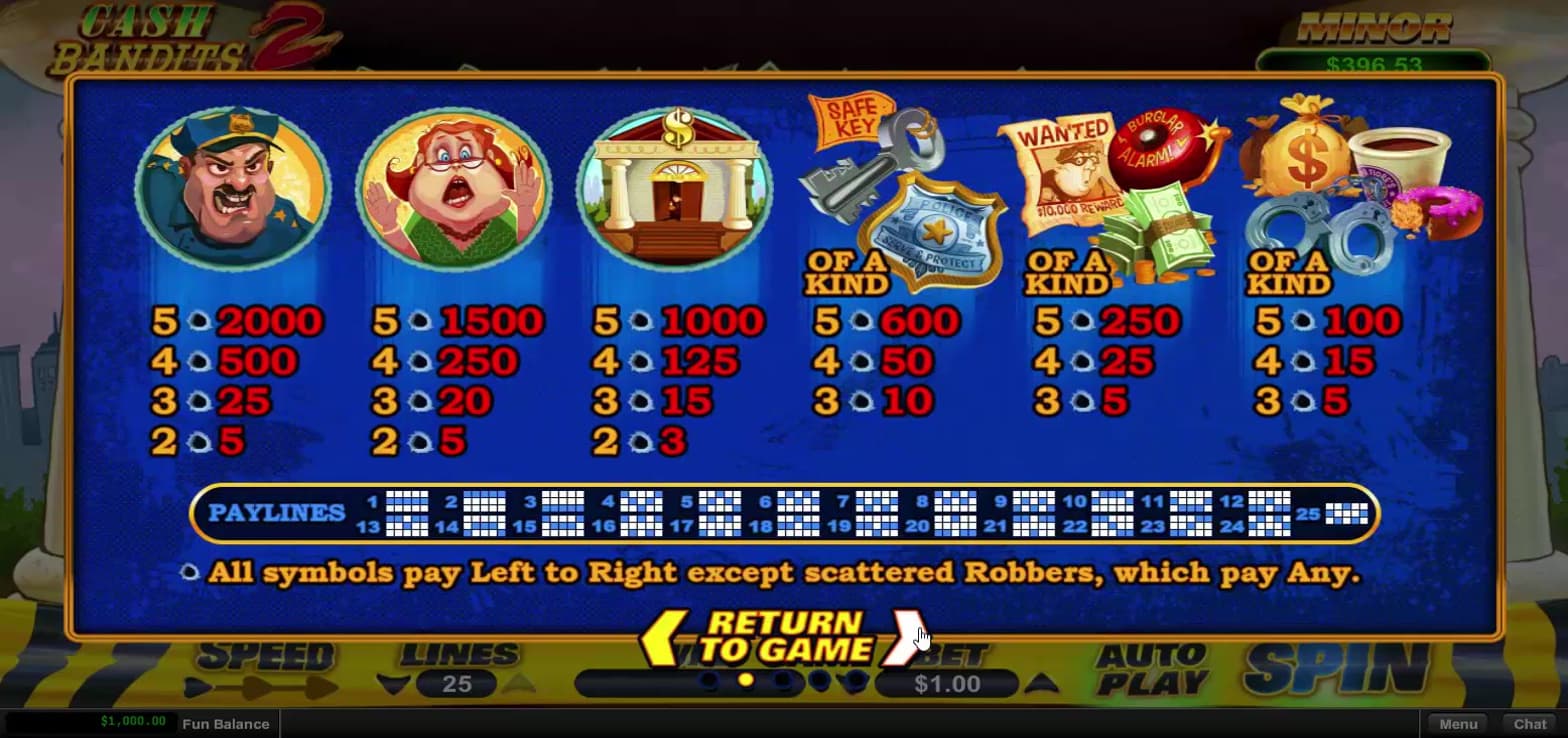 Pelin vedonlyöntipuoli, jos on yksi asia, joka minua hieman pettyi. Sinulla on täysi hallinta rivien lukumäärässä, mikä on aina mukavaa, ja sinulla voi olla jopa 25 peitettyä jokaista kierrosta. On kuitenkin myös haittapuolia, ja se on linjavedon arvo, joka menee vain 0,01 dollarista 0,25 dollariin. Maksimi panos, jonka Cash Bandits 2 sallii, on 6,25 dollaria, joten siinä ei oteta huomioon pelaajia, joilla on suuret budjetit.