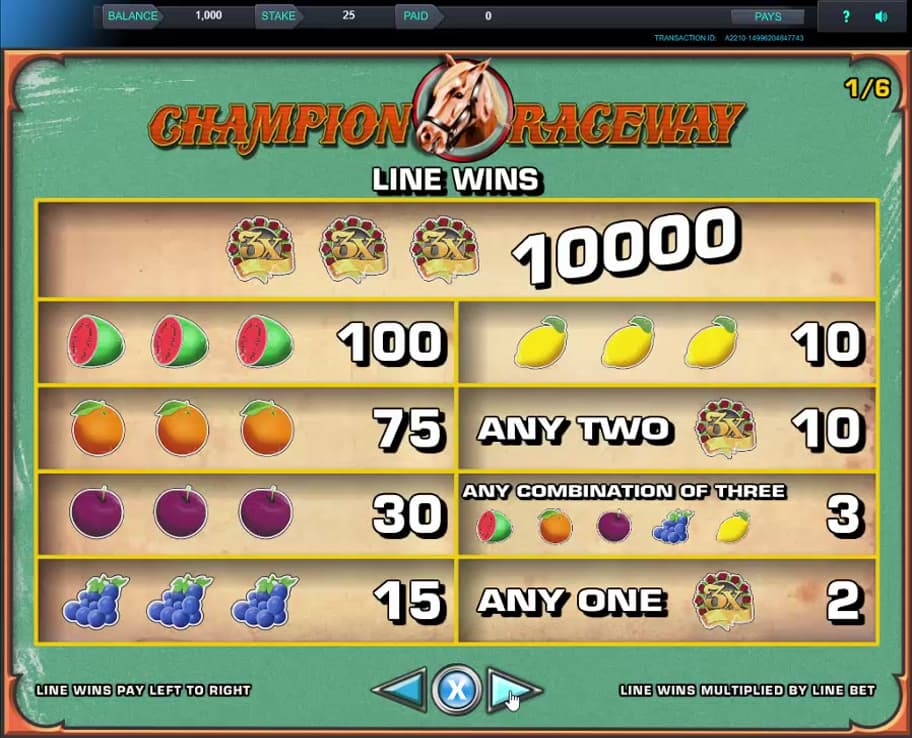 Champion Raceway on peli, joka on omistettu hevosurheiluun, melko suositulle ihmisten pelaamistoiminnalle, tosin lähinnä offline-tilassa, koska on hauskempaa käydä itse radalla. On olemassa pari peliautomaattia, joilla on jo samanlainen teema, mutta tämä on ainoa, jolla tiedän olevan klassinen asettelu ja symbolit. Champion Raceway -sarja koostuu 3 kiekosta, joista 5 on valittu aktiivisilla linjoilla. Voit hyötyä villistä kertoimesta, joka voi nostaa palkinnot huomattavasti, ja siellä on myös hevosurheiluominaisuus, jossa voit edetä ja lopulta voittaa. Peli palkitsee jopa ilmaispyöräytyksiä tietyissä tilanteissa. 10000 kolikon jättipotti on iso tavoite, jonka peli asettaa ristikkäisi.