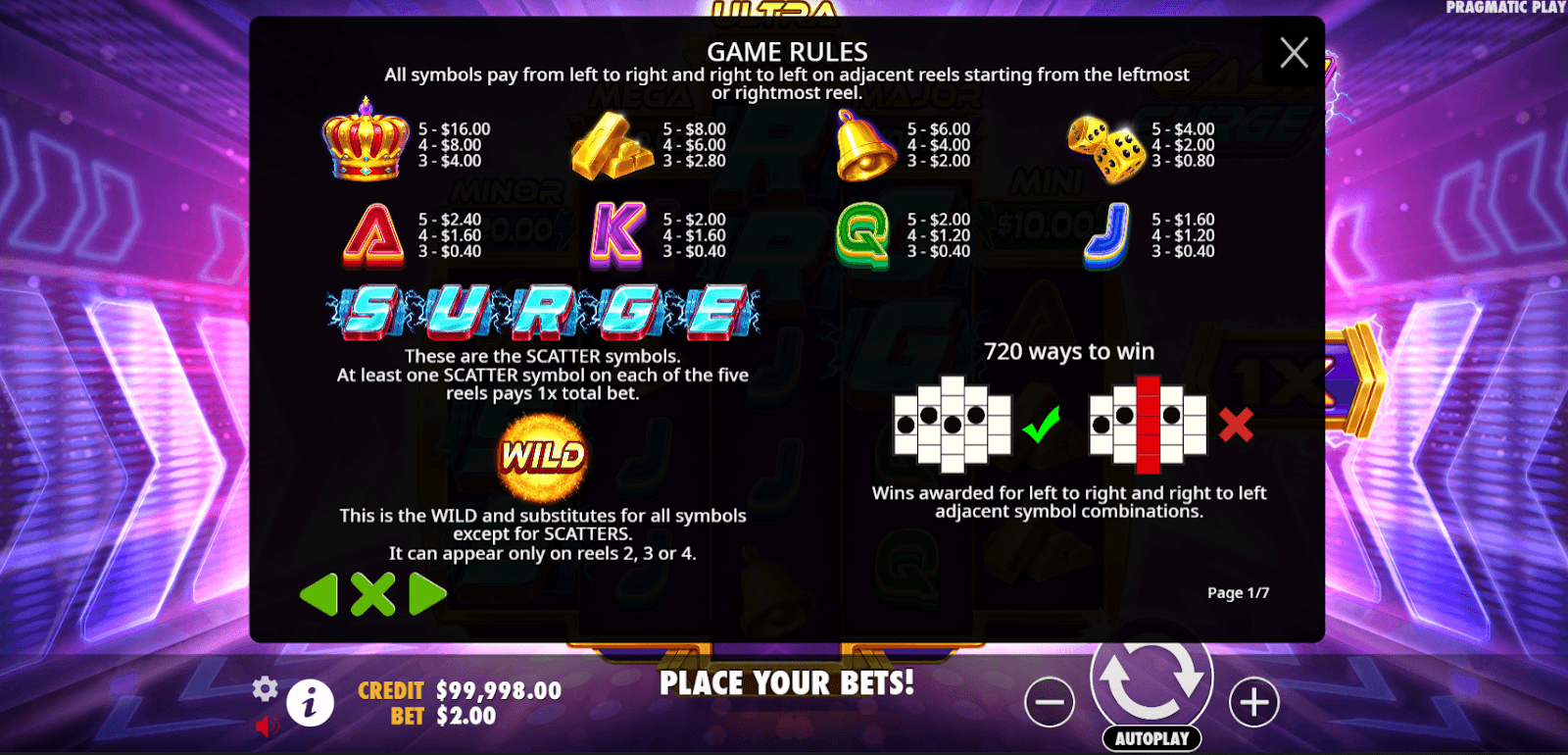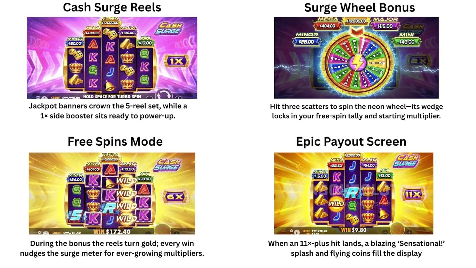 - SURGE Ilmaiskierrokset — Kerää kirjaimia S-U-R-G-E avataksesi neljä kierrosta kaikkien nykyisten progressiivisten pelien ollessa lukittuna; ylimääräiset kirjaimet lisäävät +1 kierrosta ja salama jatkaa palkintojen nousua.